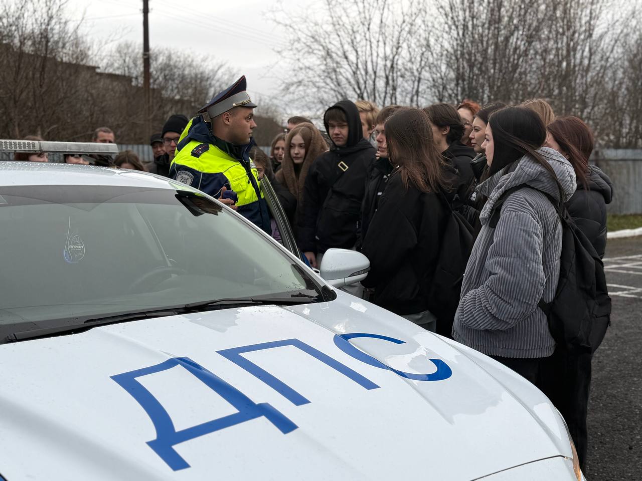 Для полного погружения в специфику службы полицейские организовали для студентов демонстрацию служебного автомобиля ДПС.