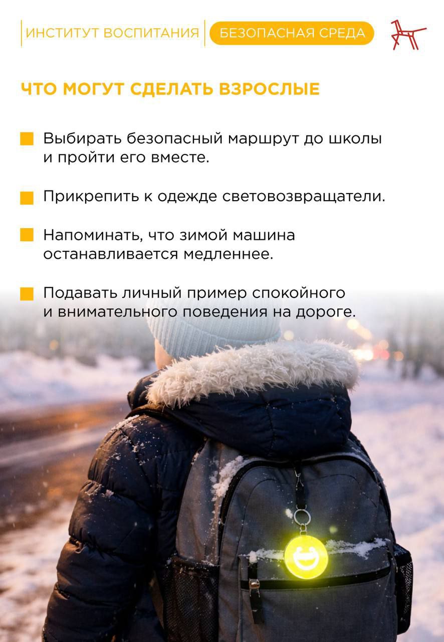 Зимой дорога становится значительно опаснее. Гололёд, ранние сумерки, сугробы у переходов и спешка делают путь в школу и домой более рискованным. Дети чаще падают, выбегают на проезжую часть и не успевают среагировать на машину.