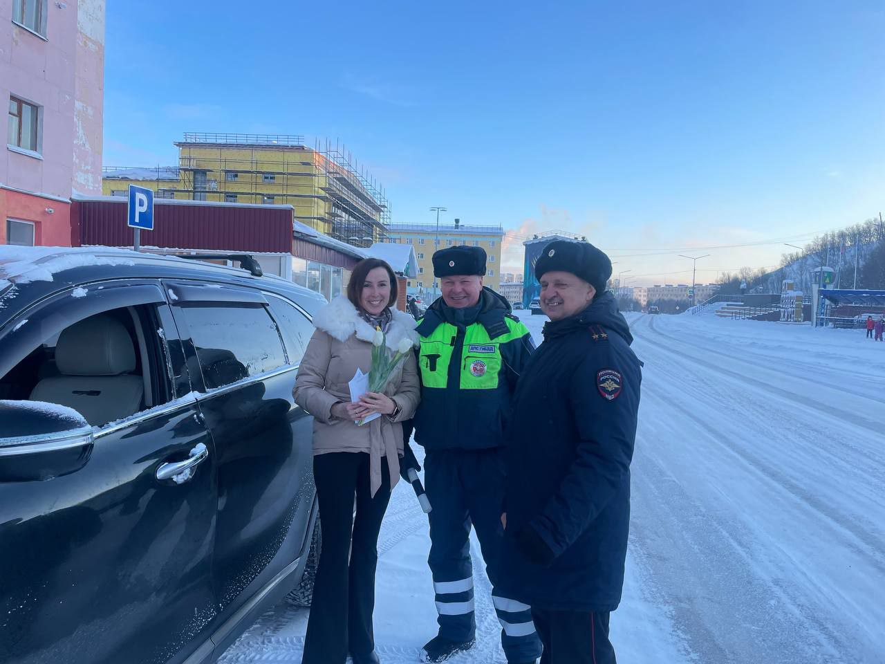 На улицы города с охапками цветов вышли сотрудники ОМВД России по ЗАТО Заозерск. Они поздравляли как водителей, так и просто прохожих.