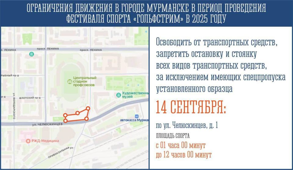 В связи с этим 14 сентября (воскресенье) будет полностью перекрыто движение:Место: мостовой переход через Кольский залив (Кольский мост).Время: с 00:00 до 16:00.Данная мера необходима для обеспечения безопасности участников и...