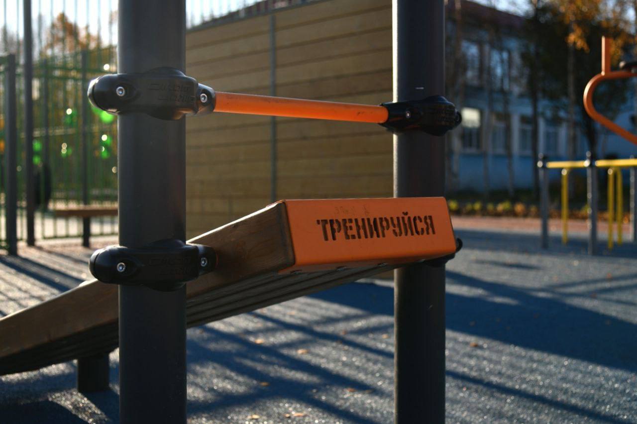 Комплекс включает футбольное поле, беговую дорожку и зону с многофункциональными тренажёрами, адаптированными под возраст и физические возможности школьников.