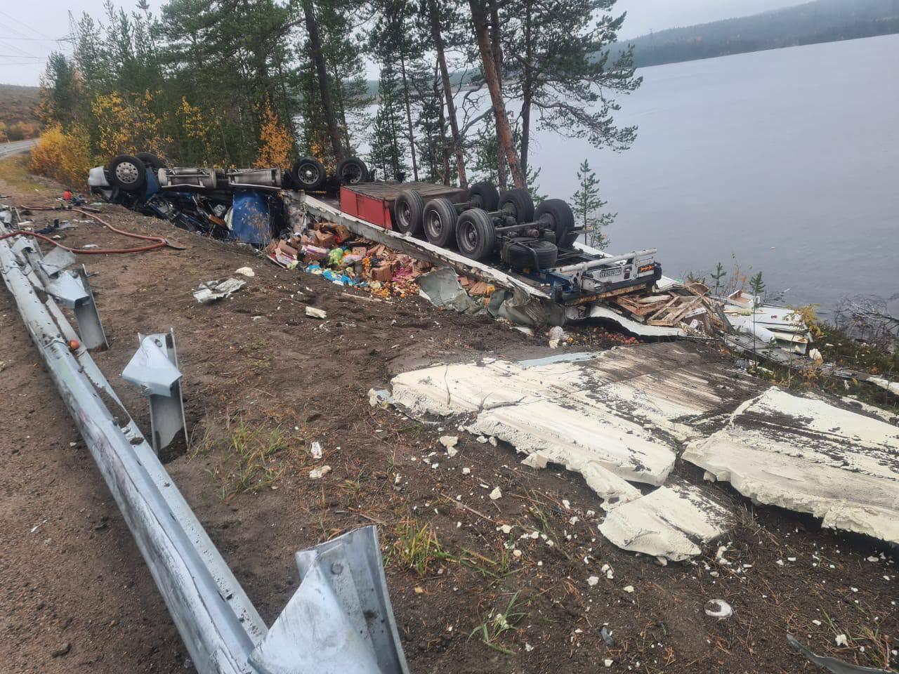 В районе Полярных Зорь на трассе "Кола" фура улетела в кювет