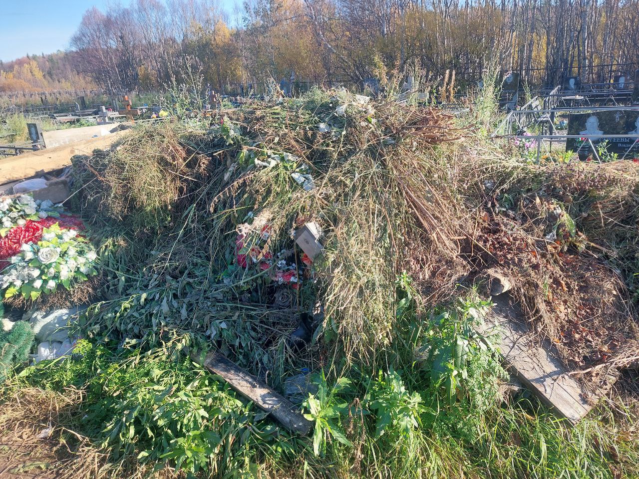 На кладбище в Мурмашах – не самая приятная картина: в глаза бросаются кучи старых венков, поломанные деревянные ограды, сухая трава и ветки.