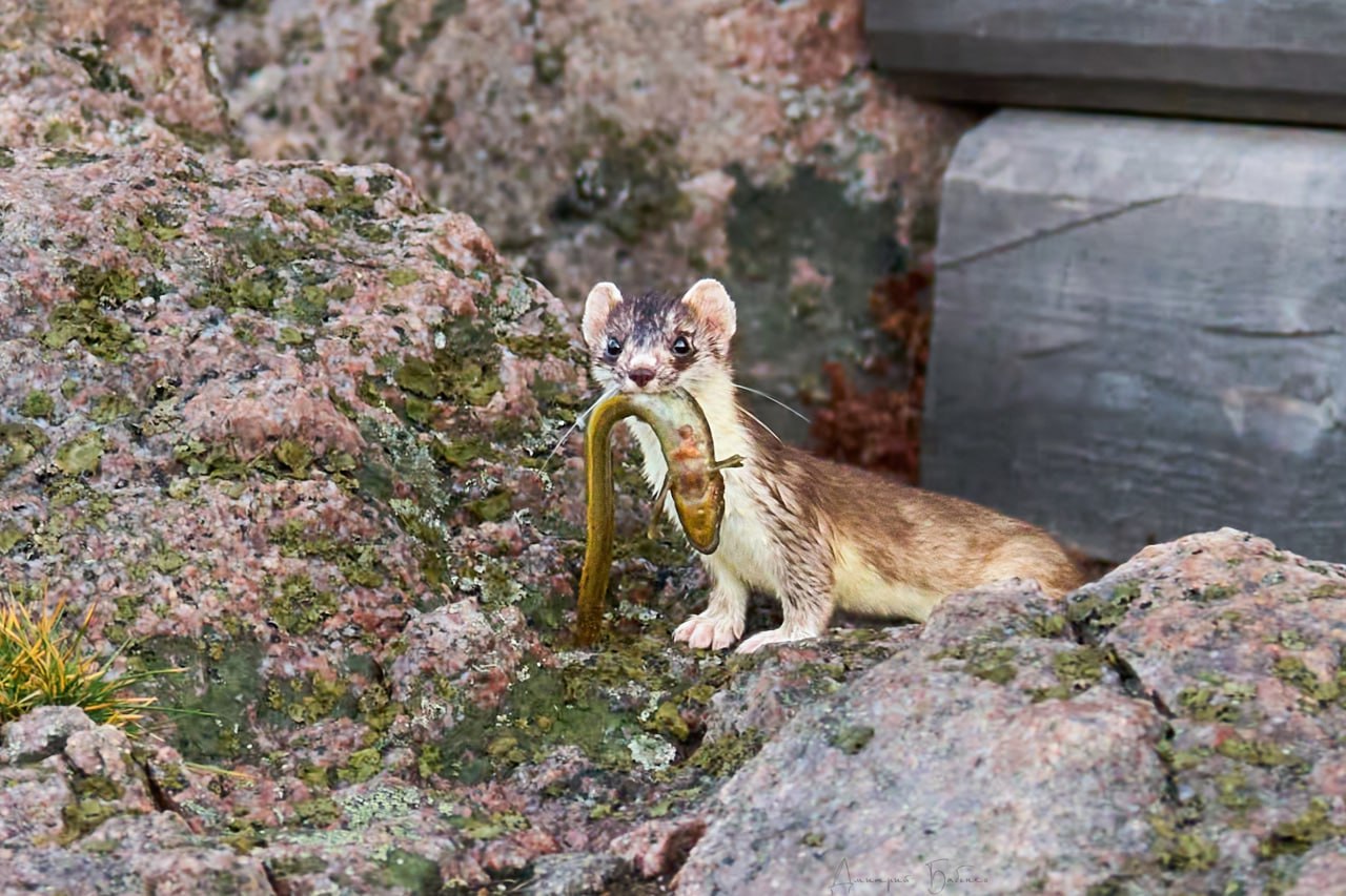 В Териберке фотографу Дмитрию Бабенко удалось запечатлеть редкий кадр – горностая с добычей в зубах. Маленький охотник явно остался доволен результатом рыбалки