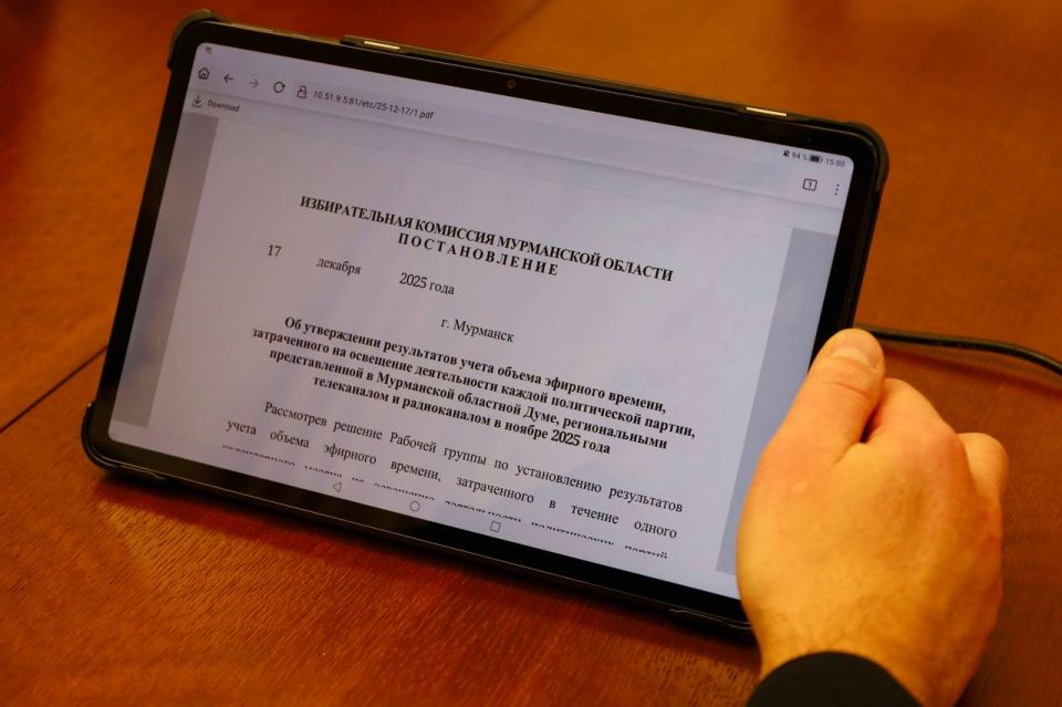 На заседании Избирательной комиссии Мурманской области утверждены результаты учета объема эфирного времени, затраченного на освещение деятельности каждой политической партии, представленной в Мурманской областной Думе, региональными телеканалом и радиоканалом в ноябре 2025 года.