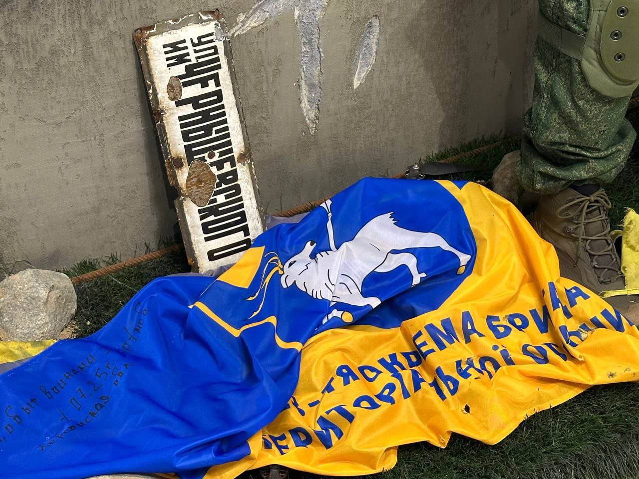 Это флаг 123-й отдельной бригады теробороны Украины, снятый российскими бойцами с водонапорной башни в Херсонской области. Также представлена брошюра, которую нашли при освобождении села Дудчаны. Эти предметы демонстрируют как ход боевых действий, так и идеологическую работу противника.