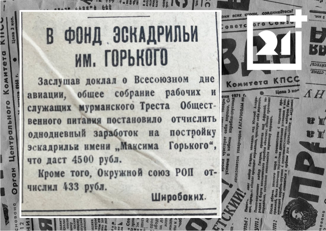 Ее автор по фамилии Широбоких информирует читателей о том, что служащие мурманского Треста общественного питания постановили отчислить однодневный заработок в размере 4500 рублей на постройку эскадрильи имени Максима Горького, а окружной Союз работников общественного питания (РОП) добавил к этой сумме еще 433 рубля.