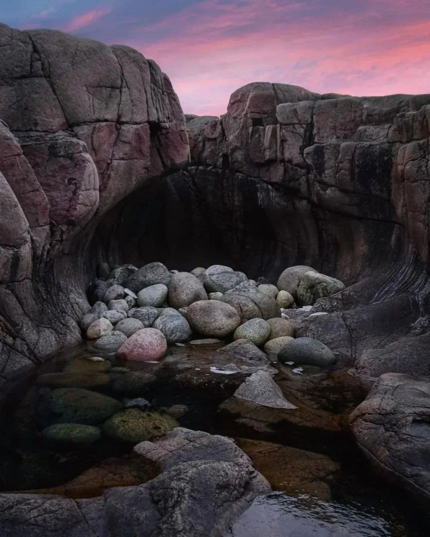 Удивительный эффект можно увидеть только когда вода, отступает от берега, обнажает выемки в скалах.