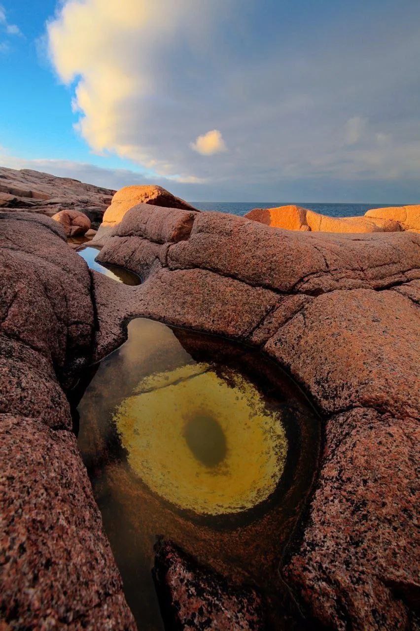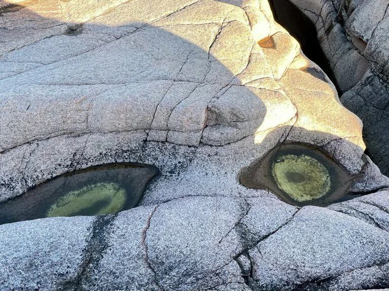 Это углубления в гранитных скалах, в которые вода попадает во время шторма. Большую часть времени такие углубления находятся без воды, в них происходят химические процессы и кристаллизация солевого раствора, что придаёт разноцветную окраску «глазу».