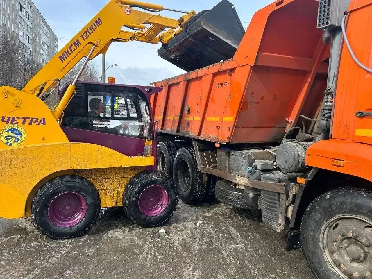 Задействовано 2 погрузчика, 1 снегоуплотнитель (ратрак), 5 самосвалов и 7 работников ручной бригады.