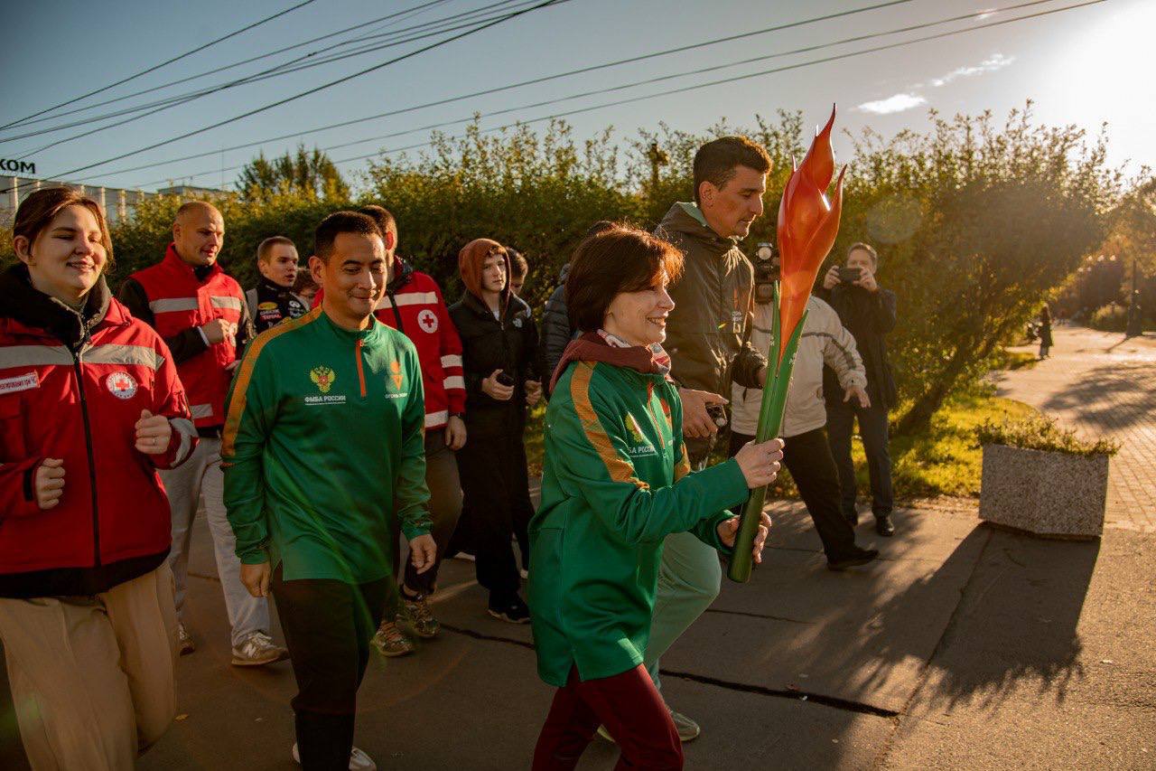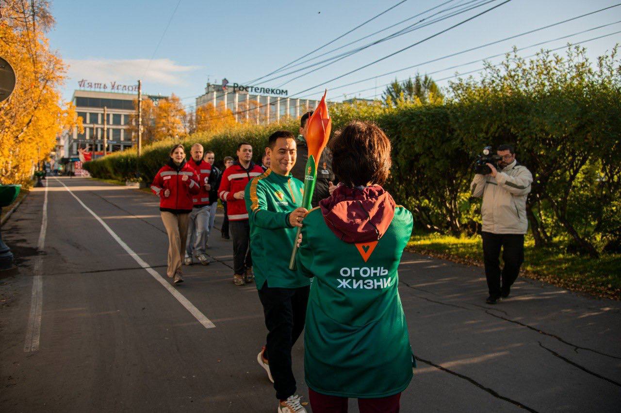 Десять факелоносцев, среди которых сенатор РФ от региона Лариса Круглова и участник кадровой программы «Герои Севера» Артур Ли, представители власти, здравоохранения и волонтеры, передавали символический огонь из рук в руки. Возглавил эстафету Артём Алискеров — амбассадор донорства костного мозга в России, победивший рак крови.