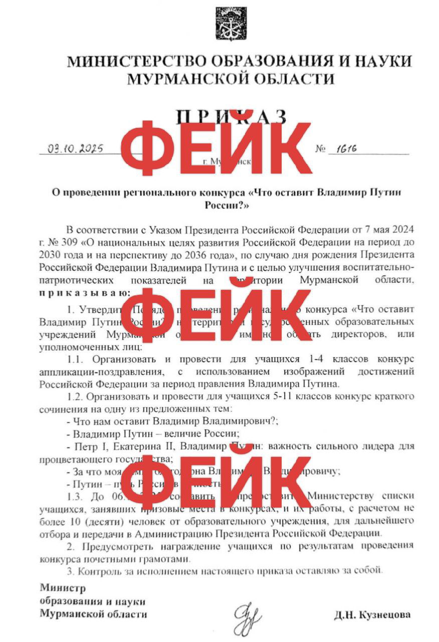 В социальных сетях и родительских чатах распространяется поддельный документ, в котором говорится о конкурсе детских сочинений "Что оставит Владимир Путин России?", организованном "по случаю дня рождения президента".