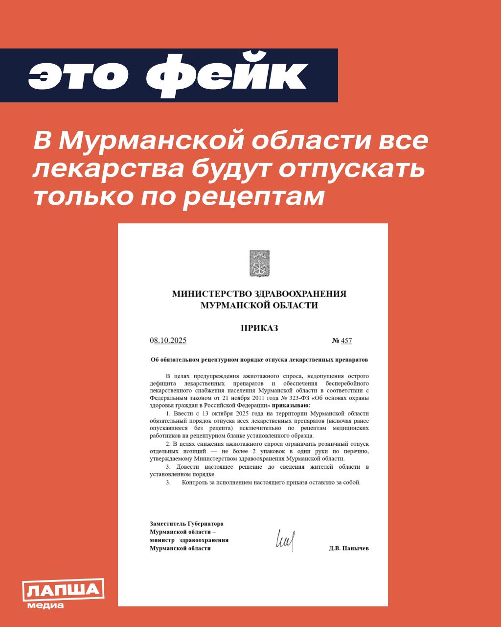 Приказ, как и «решение» сделать все препараты рецептурными — фейк. Оперштаб Мурманской области опроверг сообщения: «Распространение такой информации — один из методов вражеского информационно-психологического влияния спецслужб Украины».