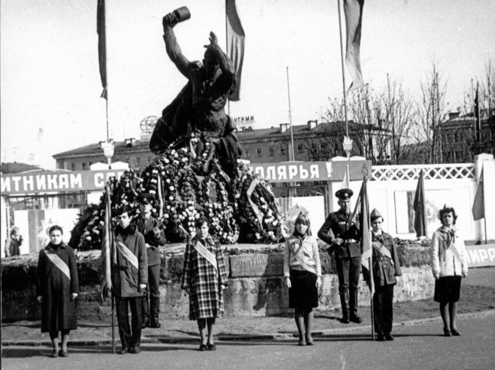 Первая скульптурная композиция, посвященная Великой Отечественной войне, в Мурманске появилась в 1947 году, но оказалась в стороне от центра и вообще жилых кварталов. На городском кладбище была установлена фигура воина, держащего в руках склоненное знамя.