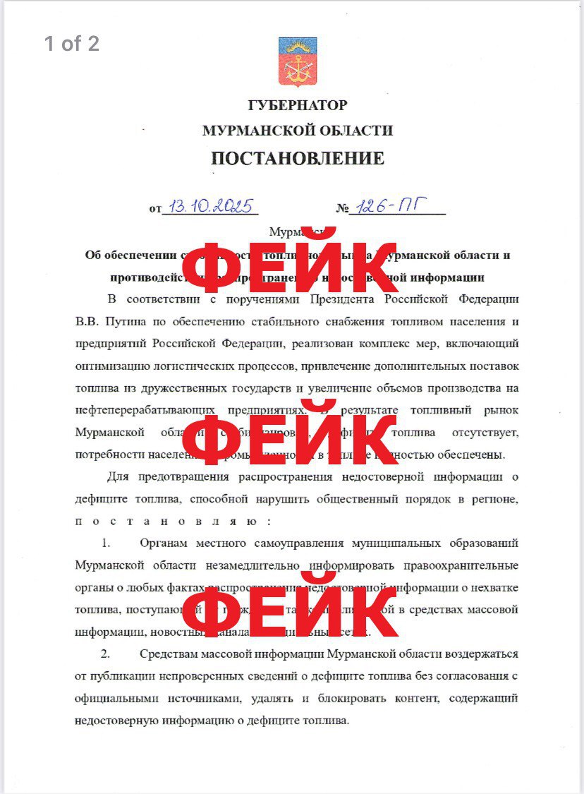 Поддельное постановление о ситуации с топливом в Мурманской области стало приходить в редакции СМИ