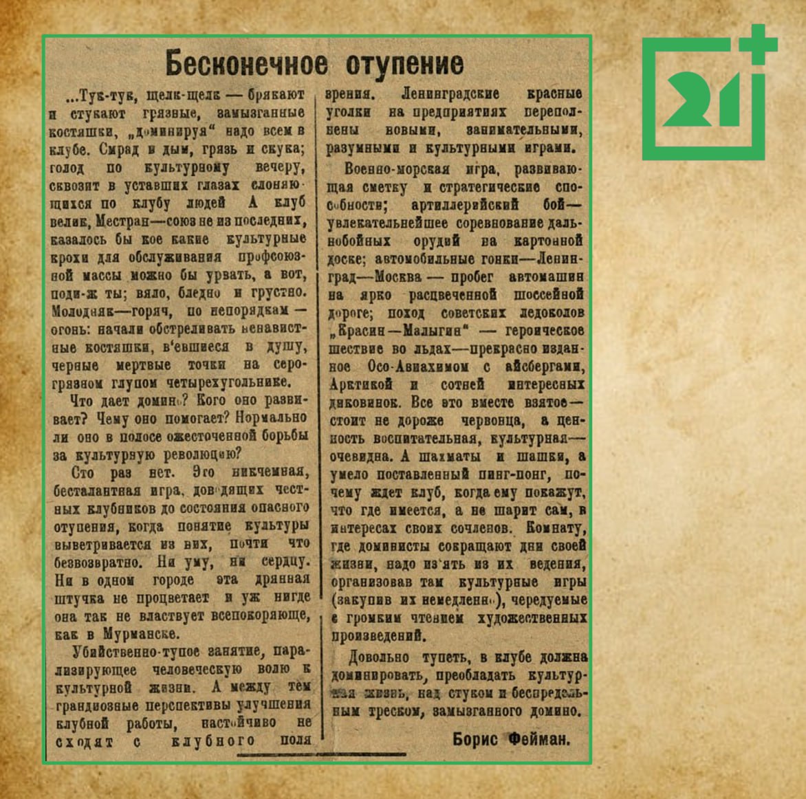А когда-то любителей «забить козла» обвиняли в «убийственно-тупом занятии, парализующем человеческую волю к культурной жизни» и призывали изгнать их из мурманских клубов.