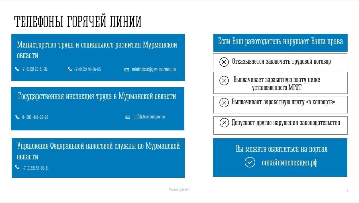 В случае возникновения ситуации, когда работник сомневается в правомерности действий нанимателя, можно обратиться по телефонам горячей линии по вопросам нелегальной занятости.