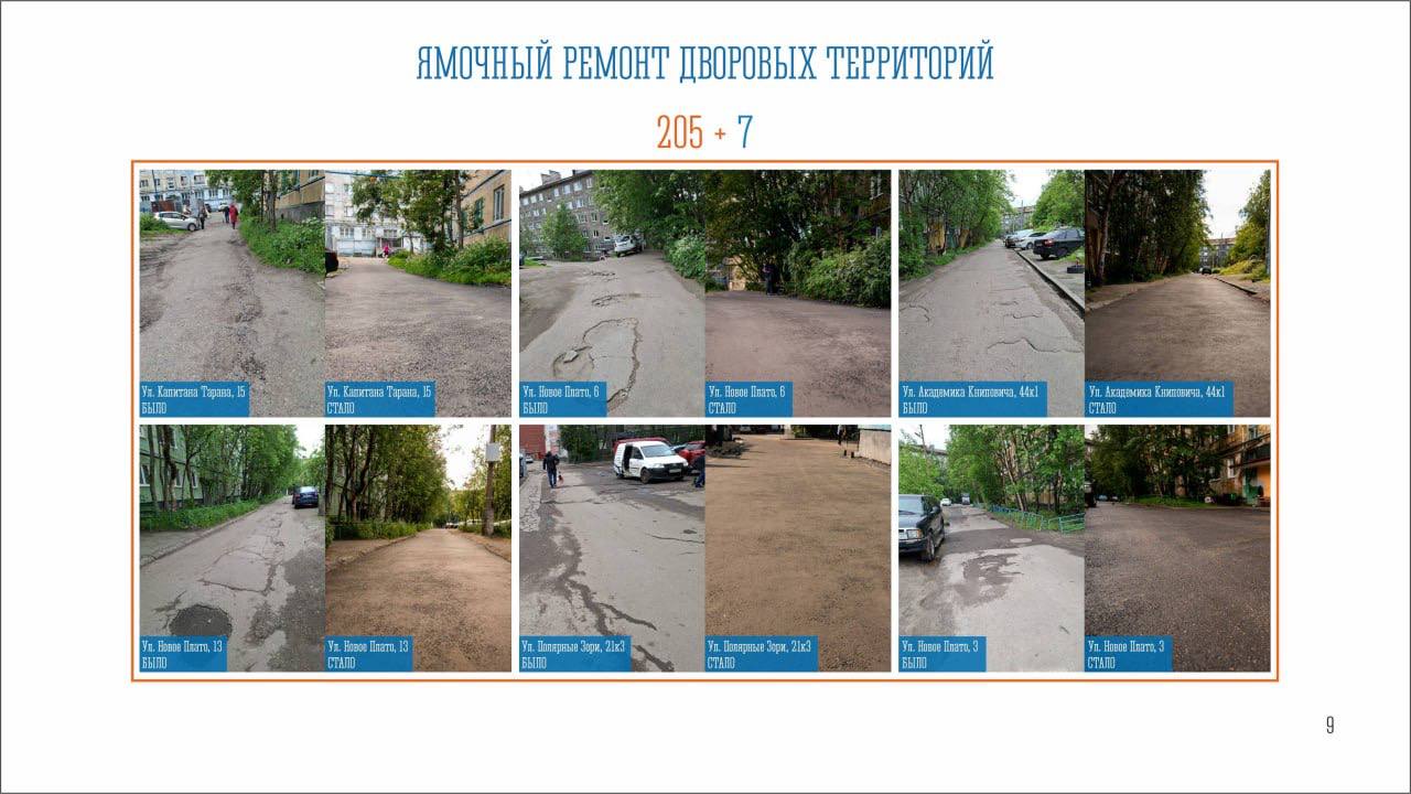Ямочный и поддерживающий ремонт проведен в 205 дворовых территориях. Работы завершены в полном объёме. В настоящее время сотрудники Управления дорожного хозяйства проводят приёмку объектов. Дополнительно в программу текущего года включено 7 дворовых территорий в центре города — на улицах Ленинградской, Карла Маркса, Володарского, Коминтерна и проспекте Ленина.