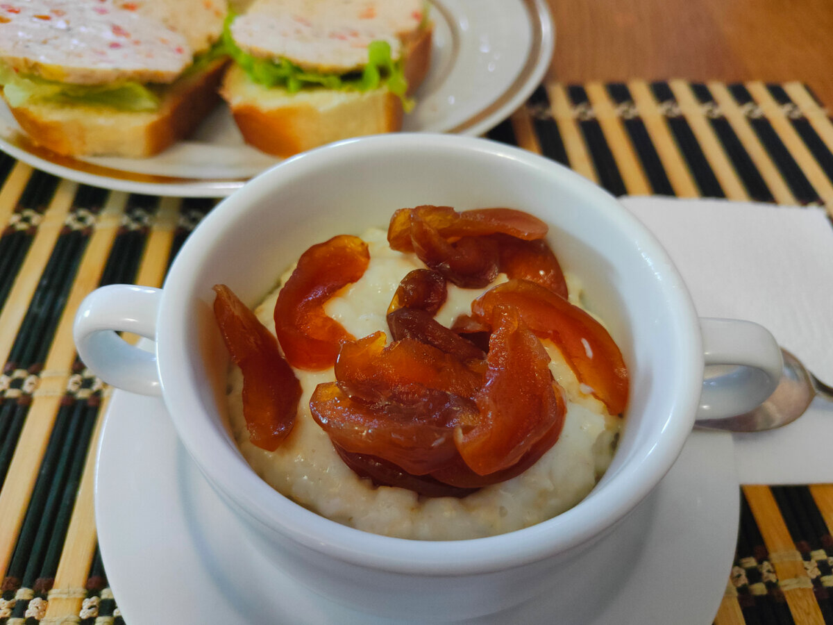 Утреннее меню может начинаться с овсяной каши, приготовленной на воде и молоке в равных пропорциях. Вместо сахара рекомендуется использовать домашние яблочные цукаты, которые добавят приятную сладость и фруктовый аромат. Кроме того, бутерброды с запеченной куриной колбасой станут отличным дополнением.