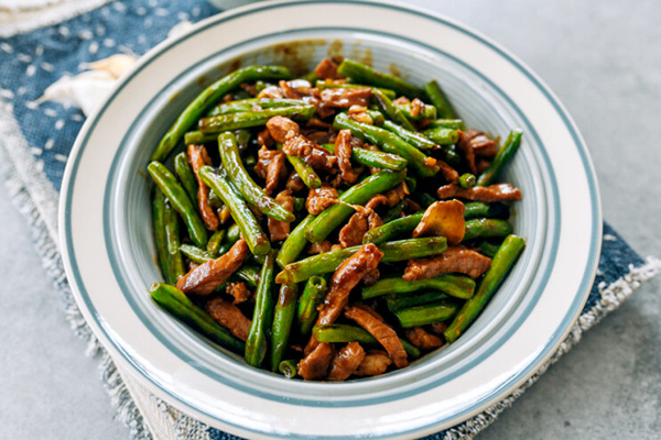 Далее разогревается столовая ложка растительного масла в сковороде, и добавляется стручковая фасоль, которая обжаривается до лёгкой золотистой корочки. Затем в сковороду кладётся свинина, которая обжаривается с обеих сторон, после чего добавляются имбирь и чеснок. После их обжарки вливается подготовленный соус и доводится до кипения. Наконец, добавляется кукурузный крахмал с водой для загустения, и на завершающем этапе соединяются свинина и фасоль. Блюдо подаётся горячим, украшенное зелёным луком и кунжутом.