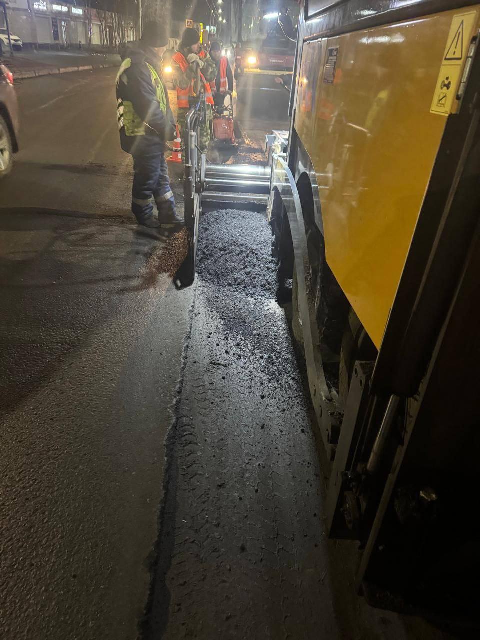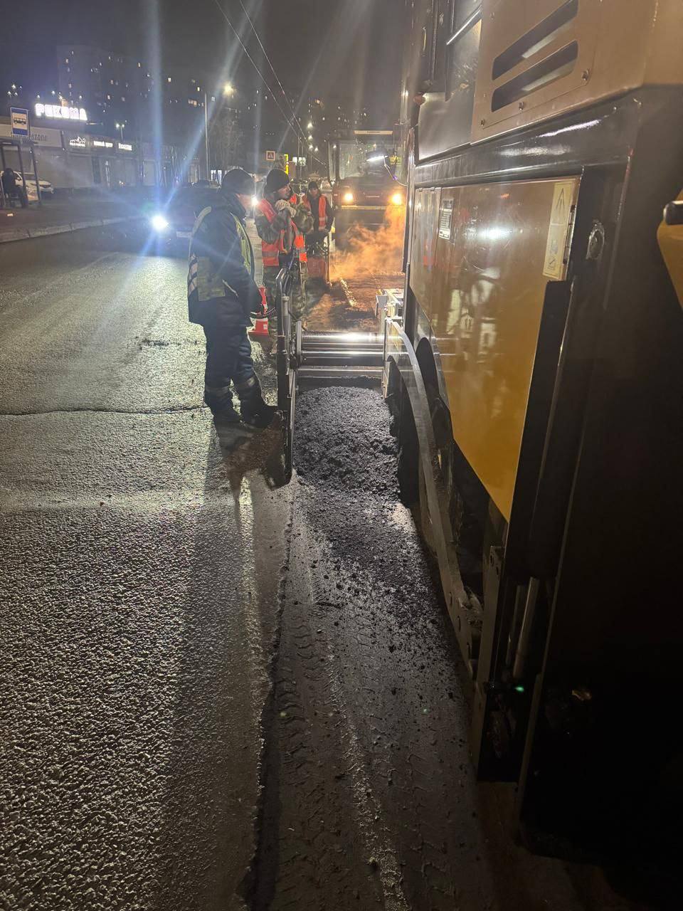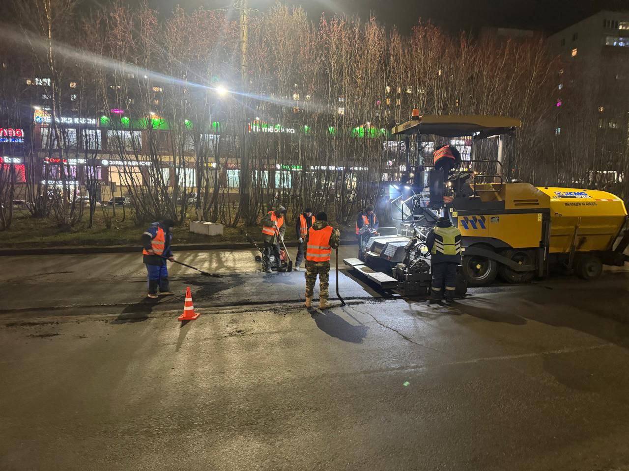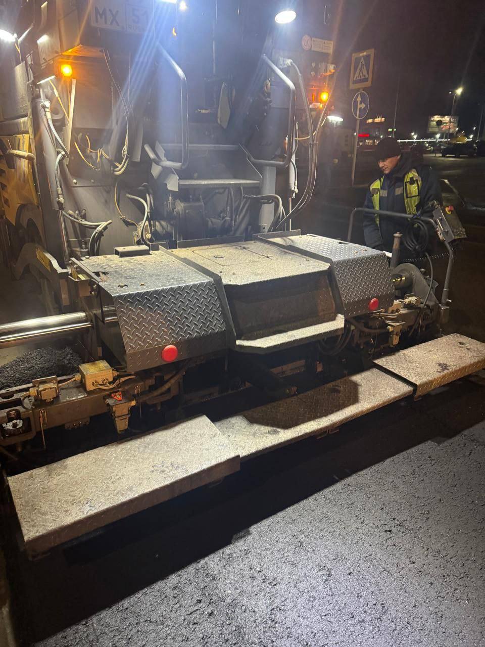 На Кольском проспекте в районе остановки общественного транспорта «ул. Морская» в южном направлении подрядчик выполняет работы по укладке асфальтобетонного покрытия в рамках гарантийных обязательств