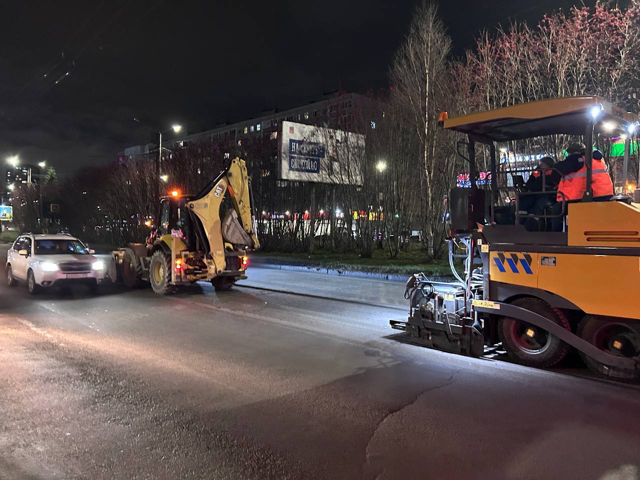 На Кольском проспекте в районе остановки общественного транспорта «ул. Морская» в южном направлении подрядчик выполняет работы по укладке асфальтобетонного покрытия в рамках гарантийных обязательств.