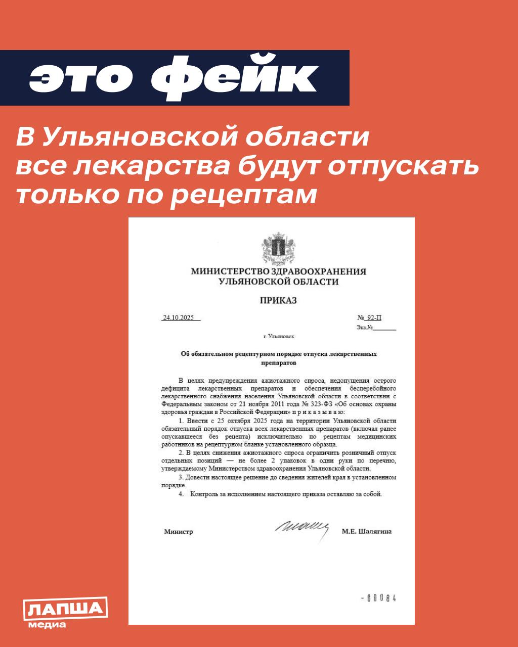 В Ульяновской области распространяют фейковый документ от имени Минздрава региона. Якобы с 25 октября все лекарства в области будут отпускать только по рецептам, а отдельные позиции ограничиваются двумя упаковками в одни руки.