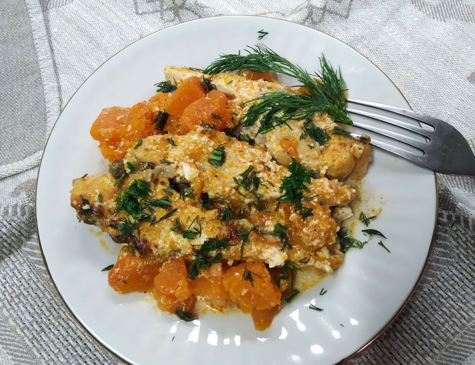 3. Тушеную тыкву выкладывают в форму для запекания, на которую затем помещают кусочки рыбного филе, предварительно посоленные. Рыбу можно укладывать плотно, чтобы вся начинка поместилась. Сверху заливают сметанным соусом, создавая полноценное блюдо, которое отправляют в заранее разогретую до 200 °C духовку. Запекание занимает около 30-40 минут, а в итоге рыба приобретает румяную корочку и остается нежной и сочной.