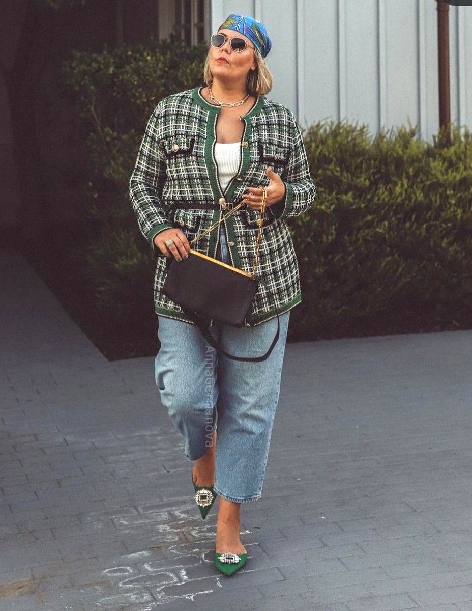 - Классические прямые джинсы идеально гармонируют с базовой белой футболкой и твидовым кардиганом в клетку. Этот нежный ансамбль можно дополнить тонким ремнем для акцента на талии. Завершит образ пара остроносых замшевых туфель в изумрудном оттенке.