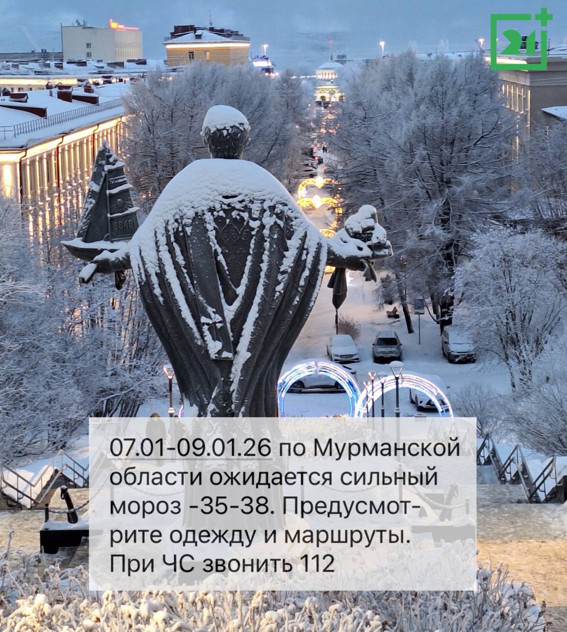 По данным ФГБУ «Мурманское УГМС», в период с 19-23 часов 7 января до конца суток 9 января 2026 года на западе и центральных районах Мурманской области ожидается сильный мороз с минимальной температурой воздуха -35...-38 С.