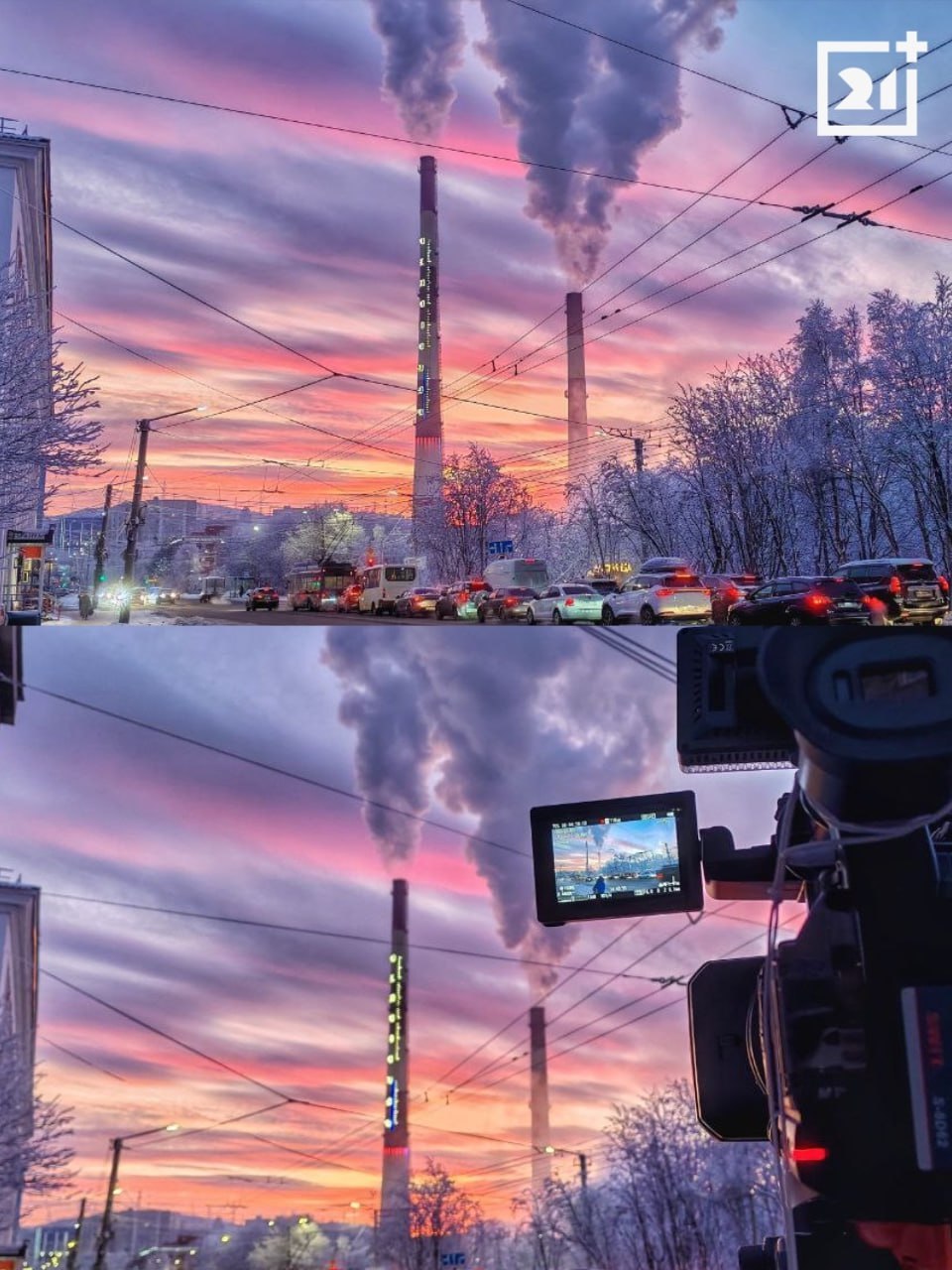 Накануне днем небо над Мурманском окрасилось в розово-фиолетовый градиент. Полярная ночь позади, поэтому отдаленное солнце посылает северянам свои первые лучи