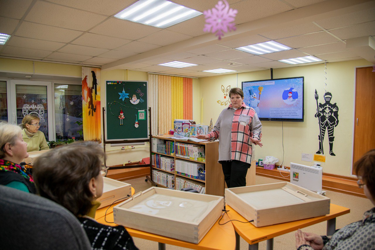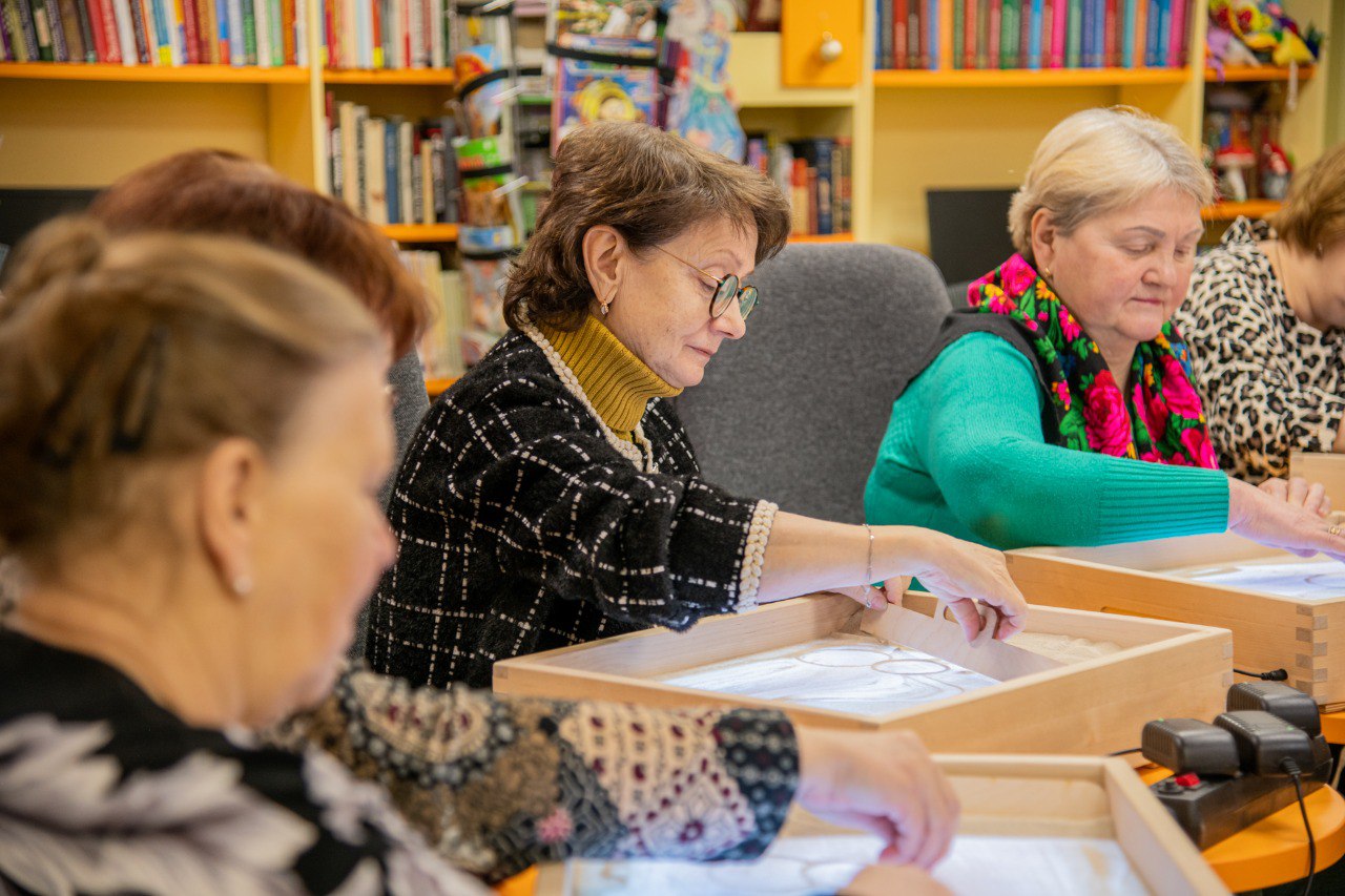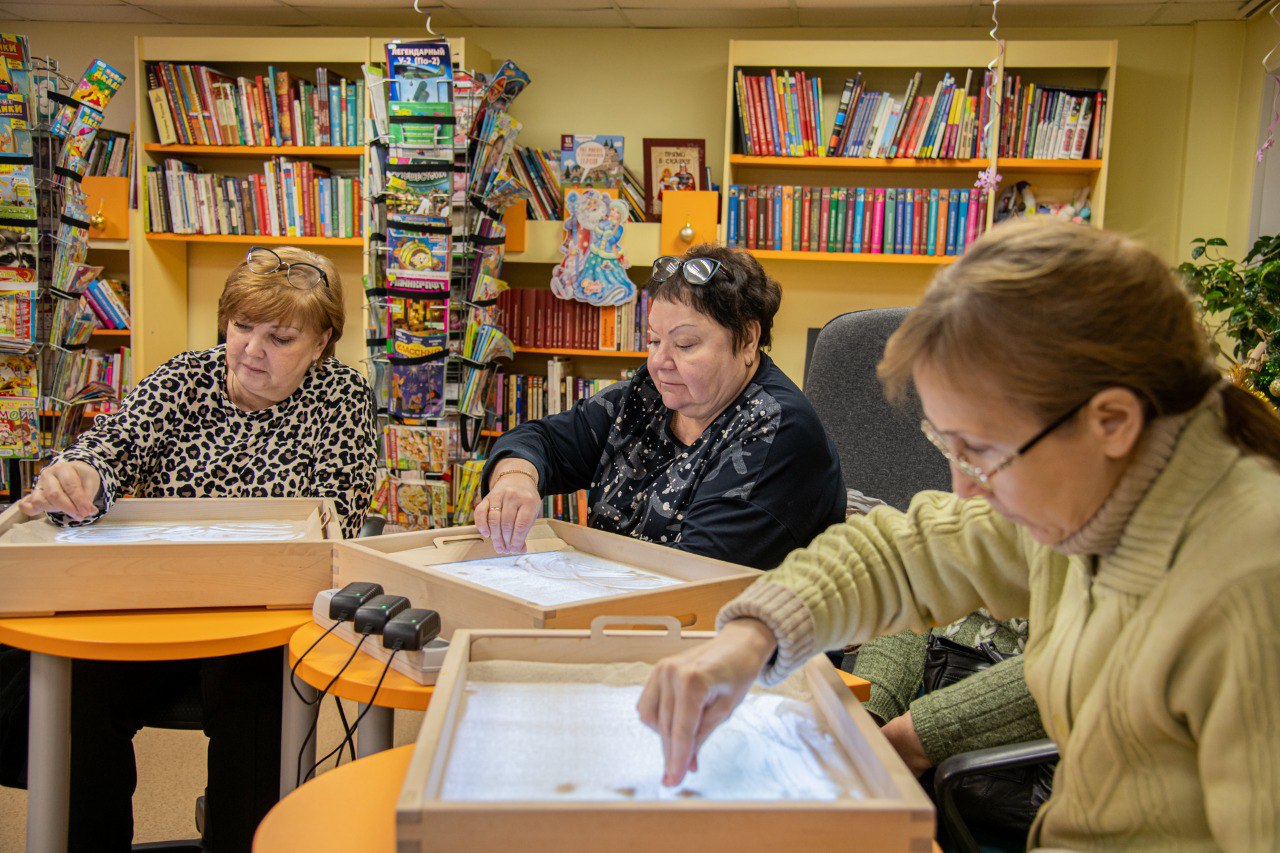 В рамках губернаторского проекта «Северное долголетие» в Детской библиотеке № 2 (ул. Адмирала флота Лобова, 46) для старшего поколения состоялся необычный мастер-класс — рисование песком на световых столах.