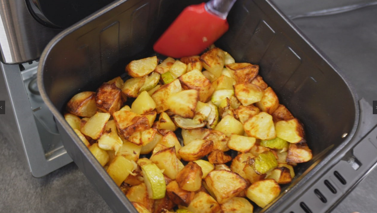 - Приготовление: Залить картофель кипятком на 20-30 минут, затем слить воду, добавить специи и масло. Перемешать с кабачками и готовить в аэрогриле при 190°C около 40 минут.