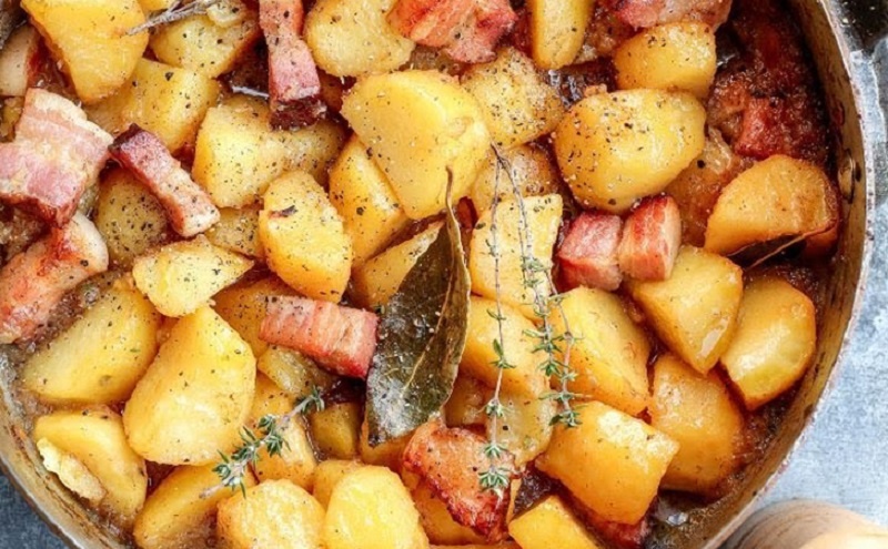 7. Верните лук и бекон в сотейник, добавьте лавровые листья, накройте крышкой и отправьте в духовку, разогретую до 180°C, на 35-40 минут, пока картофель не станет мягким.