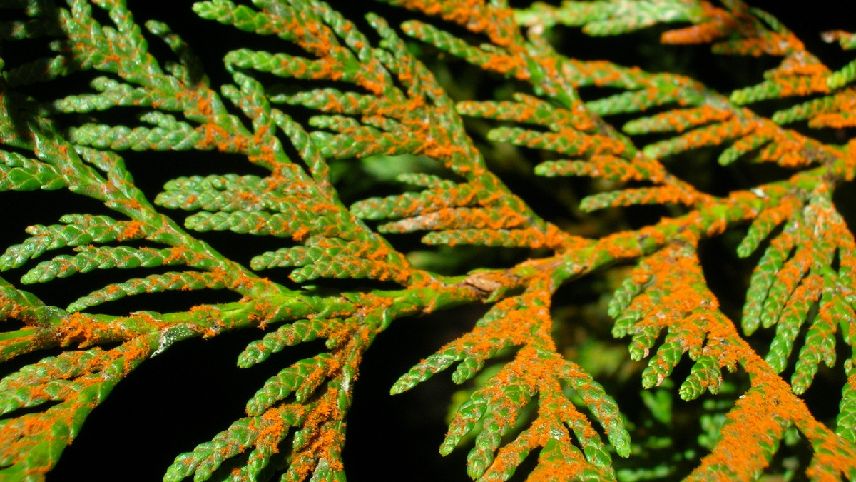 - Ржавчина. Обычно проявляется коричневыми вздутиями на ветках, желтой слизью весной. Это может привести к высыханию веток и редению кроны.