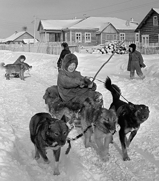 На фото — дети оленеводческого колхоза «Тундра» катаются на собачьих упряжках. Мурманская область. 1961 год.