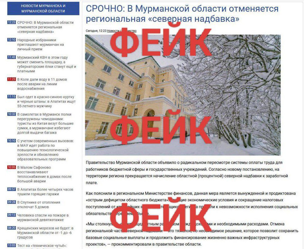 На скриншоте с якобы страницы информагентства изображена "новость" со ссылкой на региональный минфин, в которой говорится о прекращении выплаты северных надбавок из-за "острого дефицита областного бюджета".