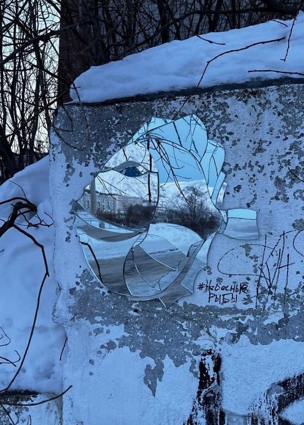 В Кировске появились загадочные зеркальные мозаики в виде рыб, птиц и других фантастических существ – это проект «Небесные рыбы» от московских художников. Солнечный свет и тени и делают каждую работу немного разной – днём и вечером, летом и зимой они выглядят по-новому