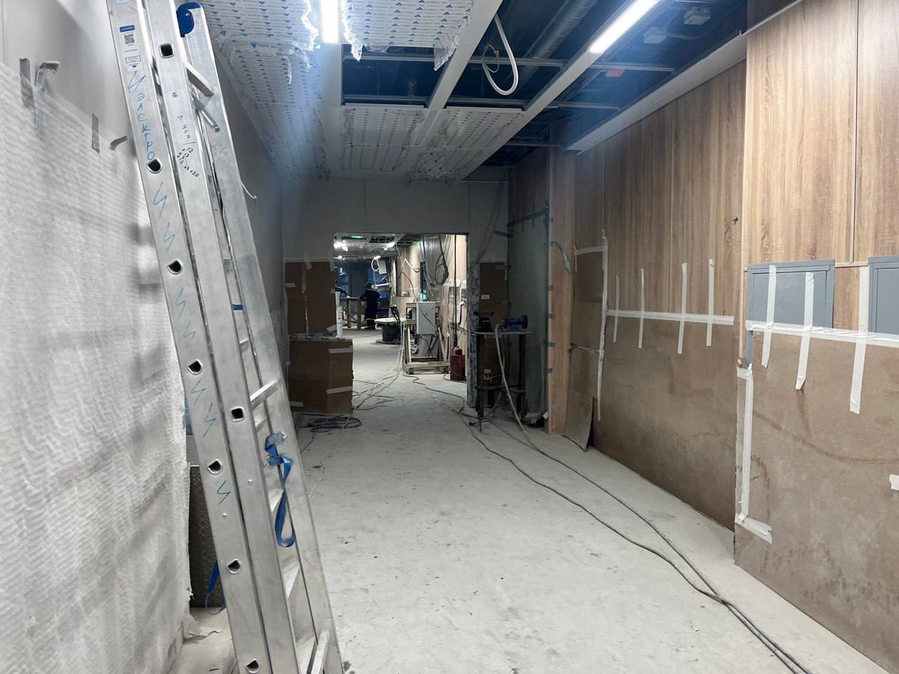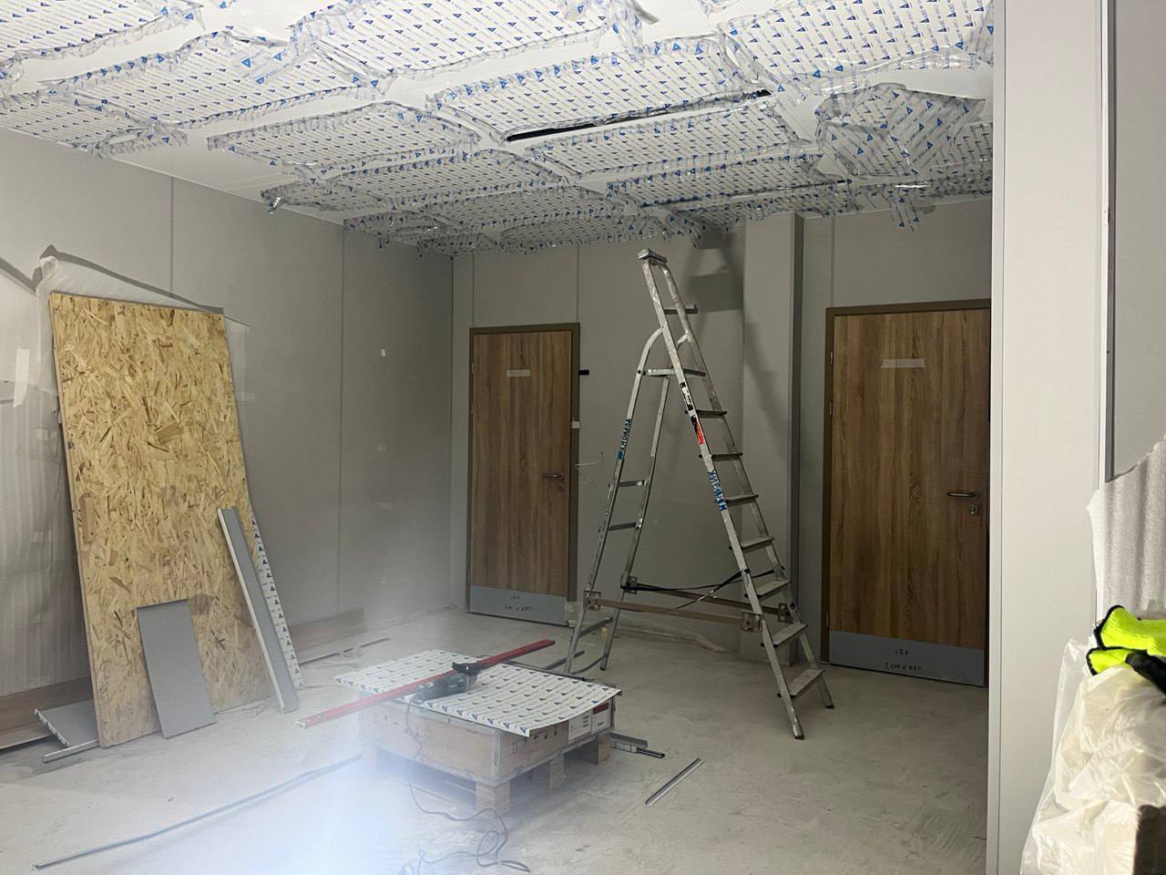 * внутри здания рабочие укладывают плитку в санузлах, монтируют потолочные и стеновые панели и готовятся стелить линолеум;