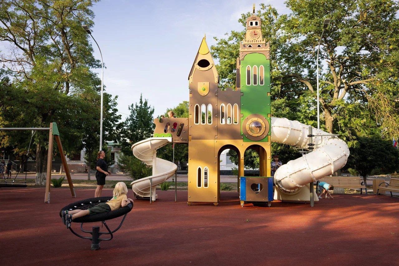 В центральном сквере Приморска построена новая современная детская площадка с мягким покрытием и освещением.