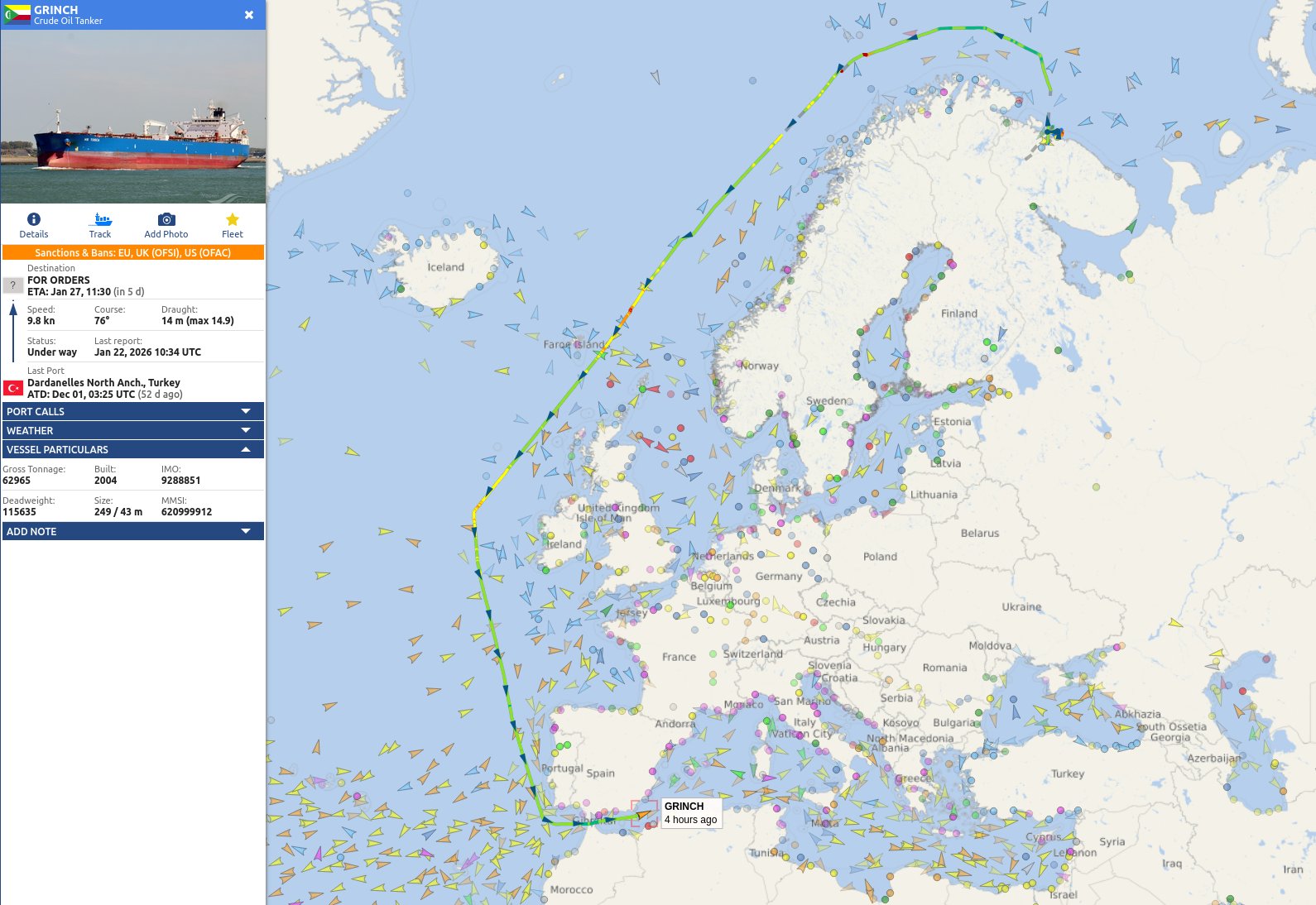 ВМС Франции перехватили судно GRINCH (следовало из Мурманска) в западной части Средиземного моря.