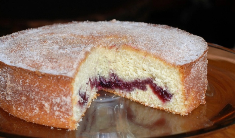 Нужны: 2 яйца, 1 упаковка кефира, 1 упаковка джема, 100 г сахара, 250 г муки, 1 ч. л. соды.