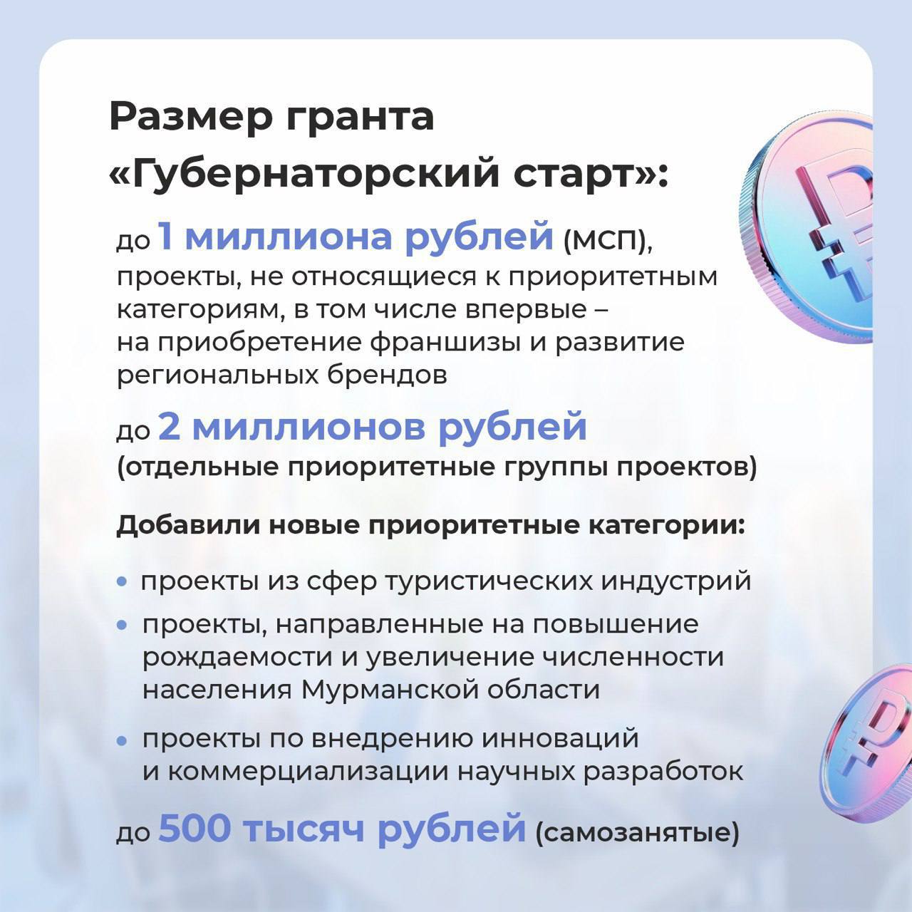 В 2026 году впервые можно использовать грант на покупку франшизы и оплату услуг для инновационных проектов. Еще одним новшеством стало расширение списка приоритетных направлений: на грант до 2 миллионов рублей могут претендовать проекты туристической направленности и инициативы по повышению рождаемости, а на сумму до 1 млн рублей — региональные бренды.