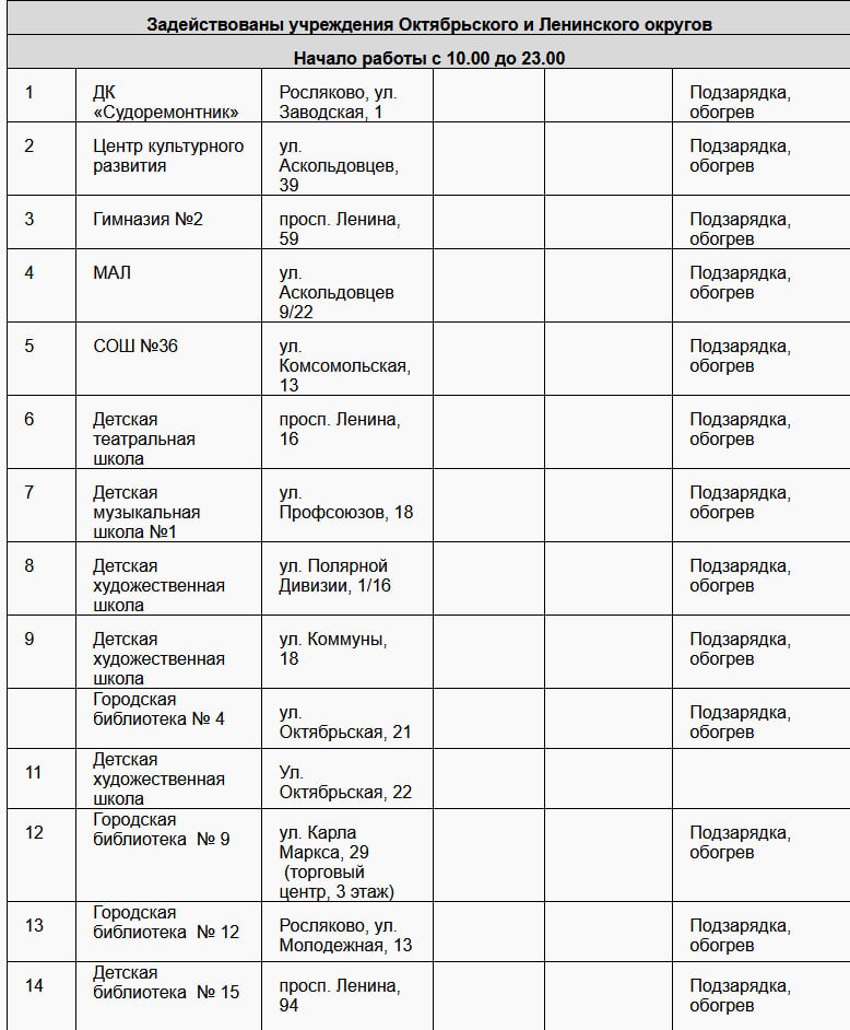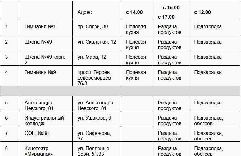 С 10 до 23 часов мурманчан ждут в городских учреждениях, где можно воспользоваться чайником и микроволновой печью. В зданиях школ пункты помощи работают до рамок металлодетекторов для соблюдения требований безопасности.