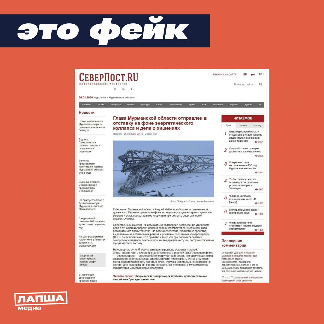 В соцсетях пишут о якобы отставке губернатора Мурманской области Андрея Чибиса на фоне энергетического кризиса в регионе. В подтверждение приводят «скриншот» с сайта местного СМИ.