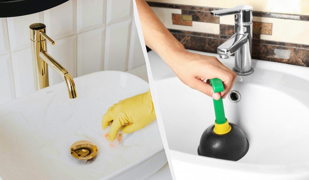 Первый шаг — освободить слив от видимого мусора и закрыть кран, чтобы не расплескать остатки воды. Затем выбирают один из четырёх рабочих подходов, проверяя их последовательность по ситуации.