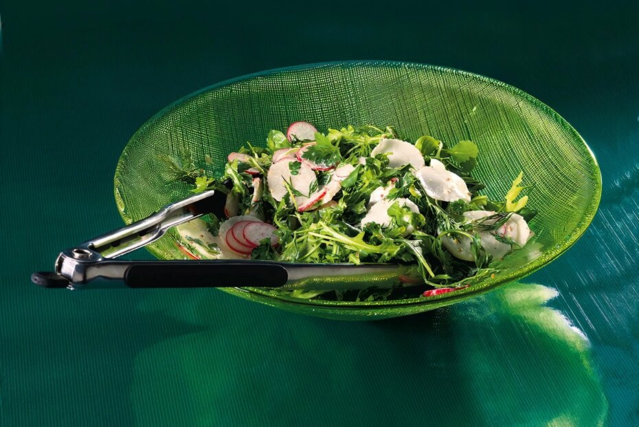 Простой салат, который мгновенно вызывает ощущение свежести и легкости. Листья служат базой, к ним добавляются тонко нарезанные дайкон и редис, чтобы вкус держался ярко и чисто. Взаимодействие трав — петрушки и укропа — добавляет свежую зелень и ароматы, избегая перегруза вкуса.