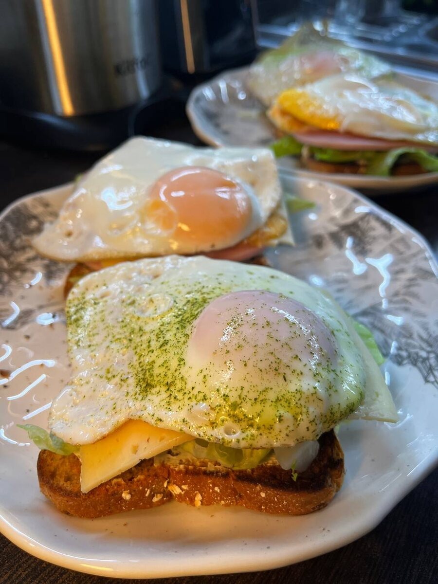 Завтрак: Яичница на хлебе с творожным сыром и колбасой