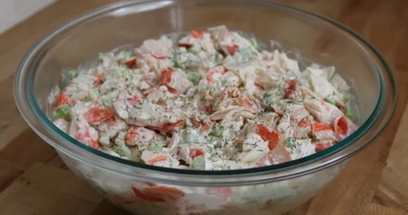Украсить салат можно свежей зеленью и, если желаете, оставшимися крабовыми палочками.