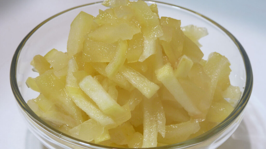 Яблоки следует тщательно подготовить: разрезать на четвертинки и удалить сердцевину. Если кожура слишком жесткая, то ее лучше срезать. Фрукты можно либо натереть на терке, либо нарезать мелкой соломкой, после чего вес яблок стоит определить в уже нарезанном виде.